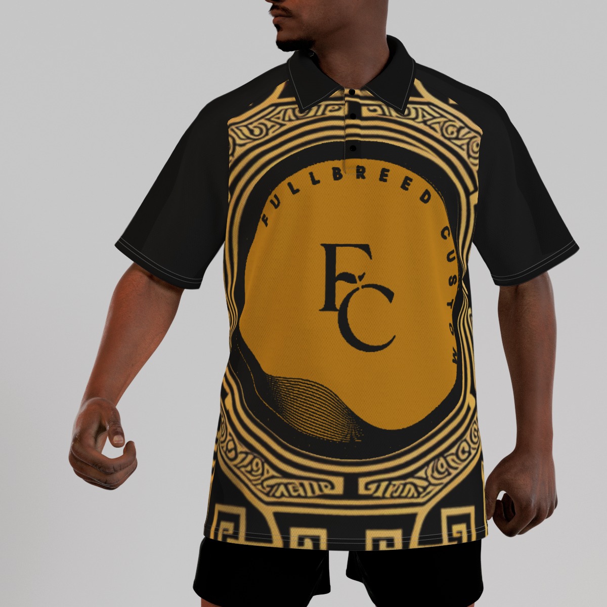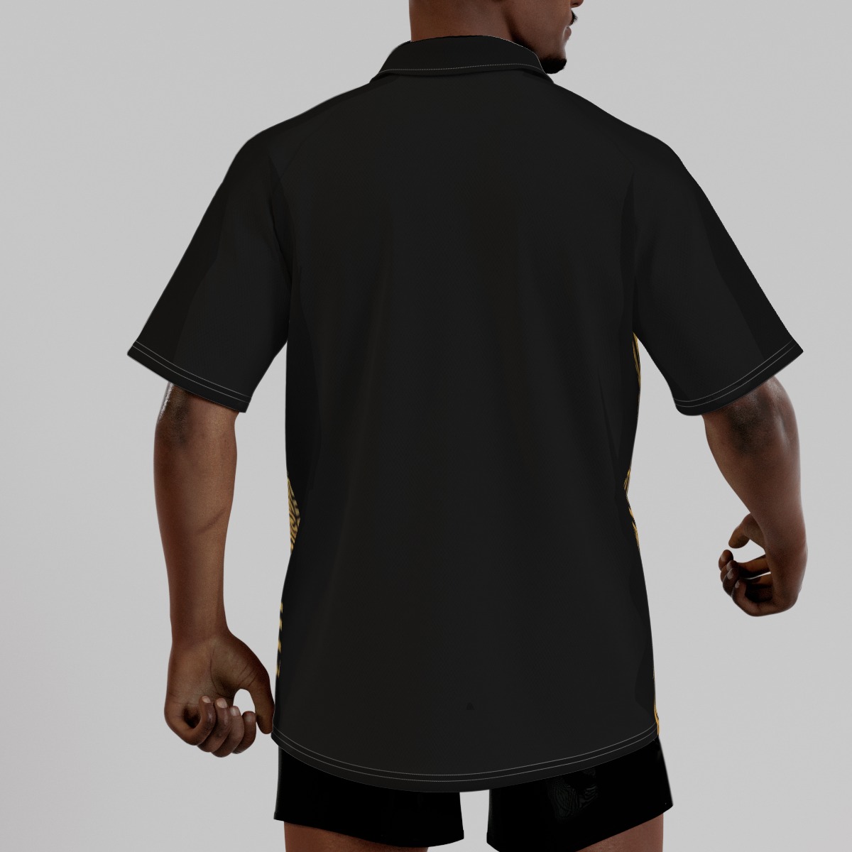 - Short sleeve, raglan sleeve, stand-up collar, button closure