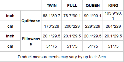 • TWIN size include one quiltcase and one pillowcase, the other size are one quiltcase and two pillowcases