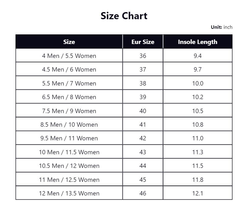 4 Men / 5.5 Women, 5.5 Men / 7 Women, 8.5 Men / 10 Women, 9.5 Men / 11 Women, 10 Men / 11.5 Women, 11 Men / 12.5 Women, 12 Men / 13.5 Women, 4.5 Men / 6 Women, 6.5 Men / 8 Women, 7.5 Men / 9 Women, 10.5 Men / 12 Women