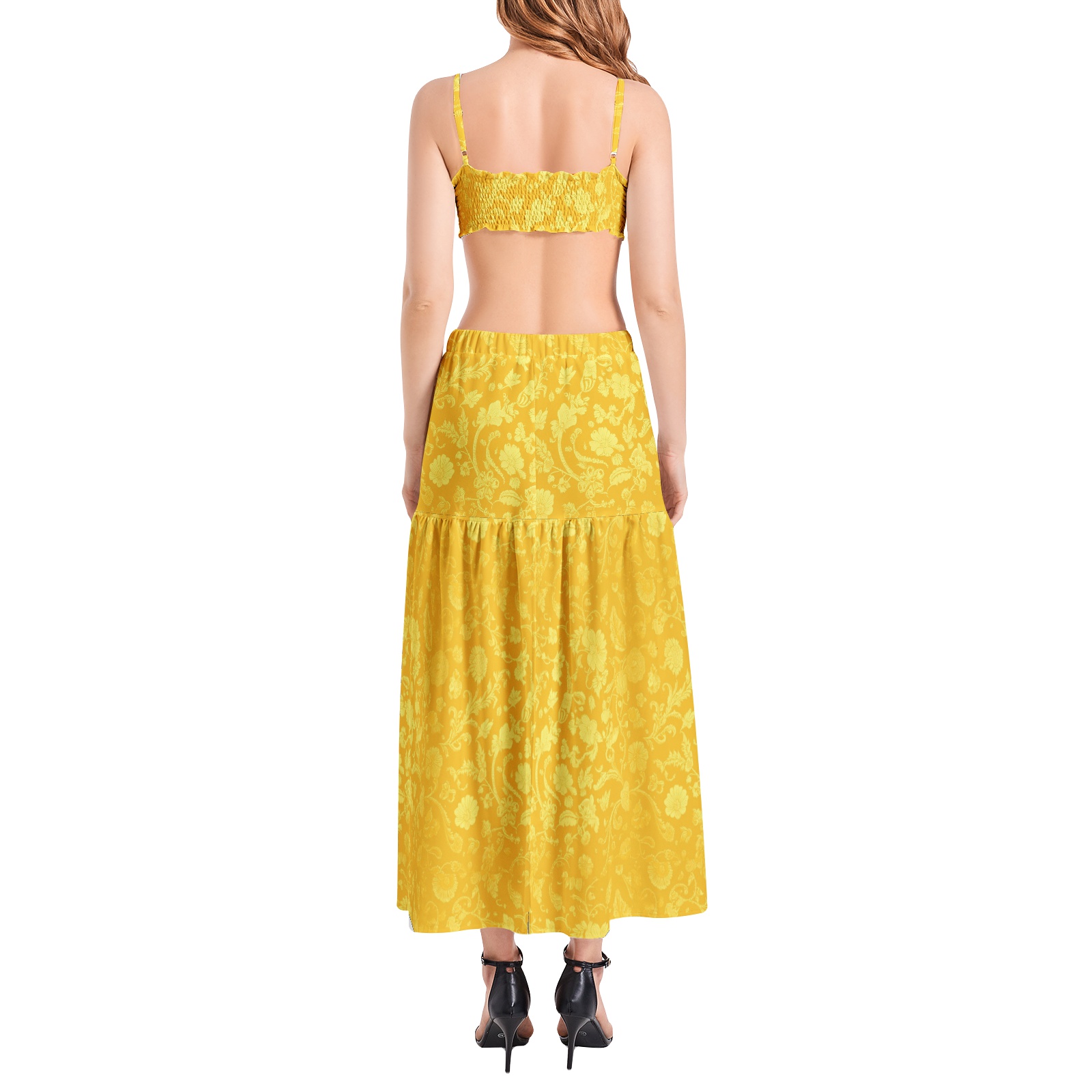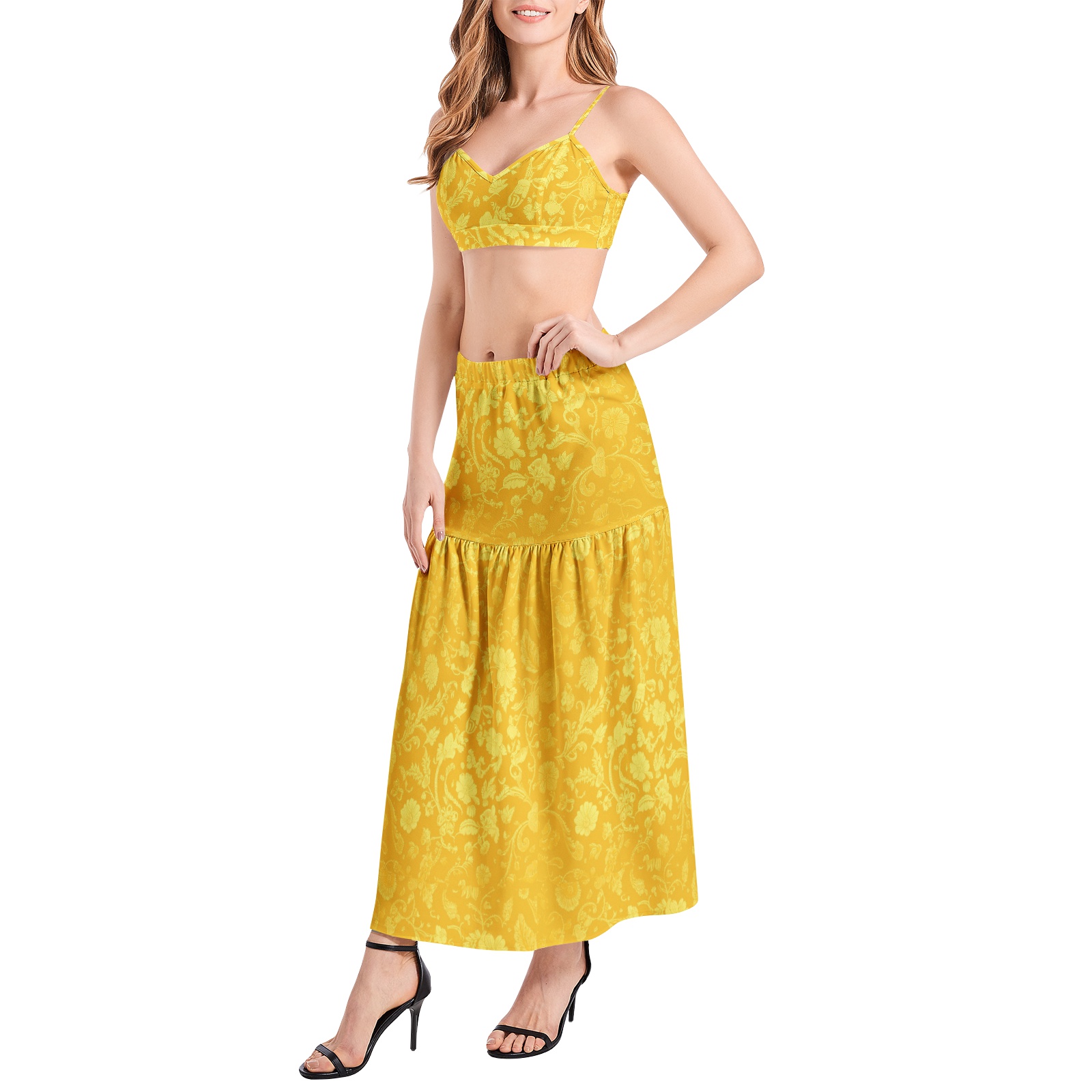 Adjustable spaghetti strap, Ruched crop cami top, Long length skirt, Slit thigh, Soft two pieces suit for Women