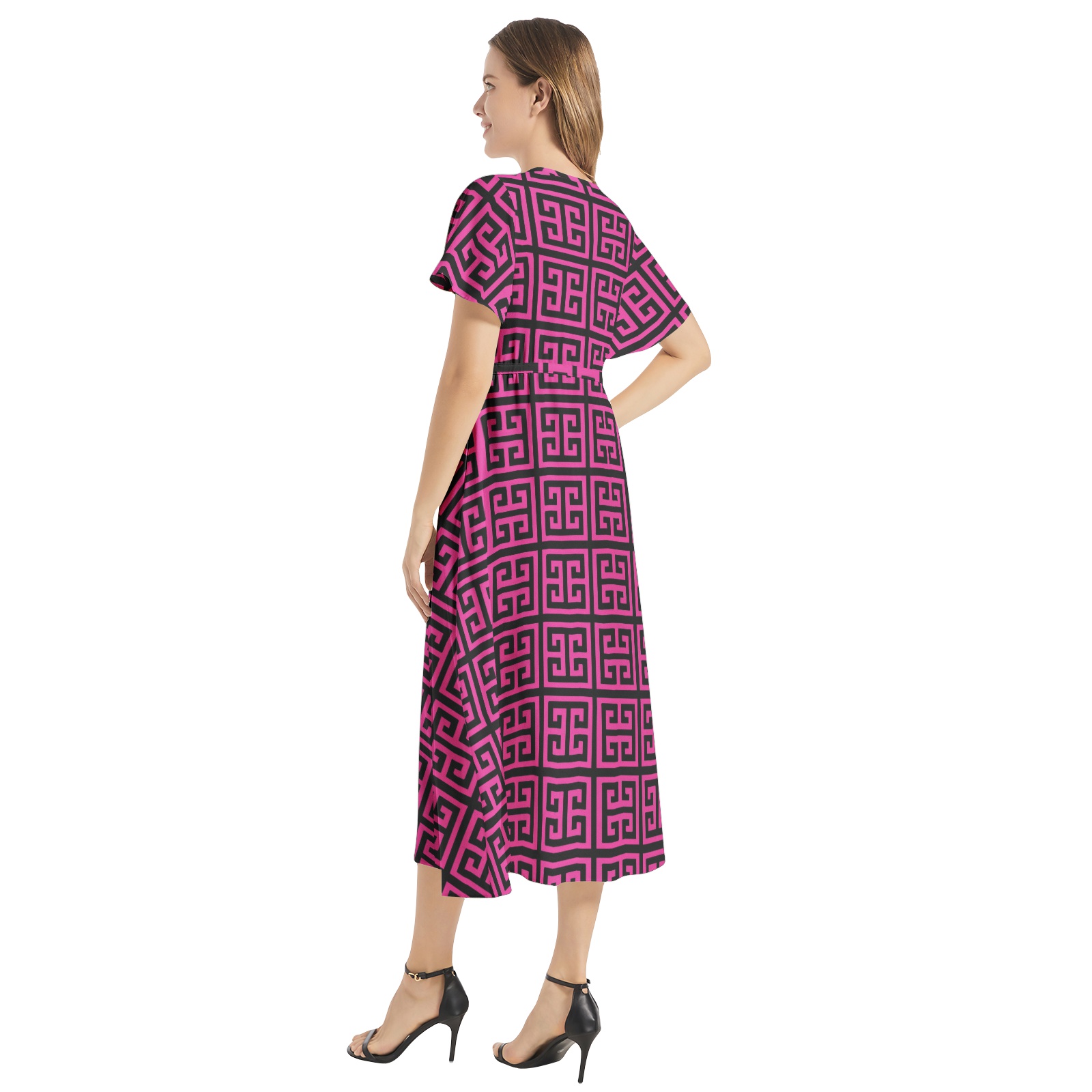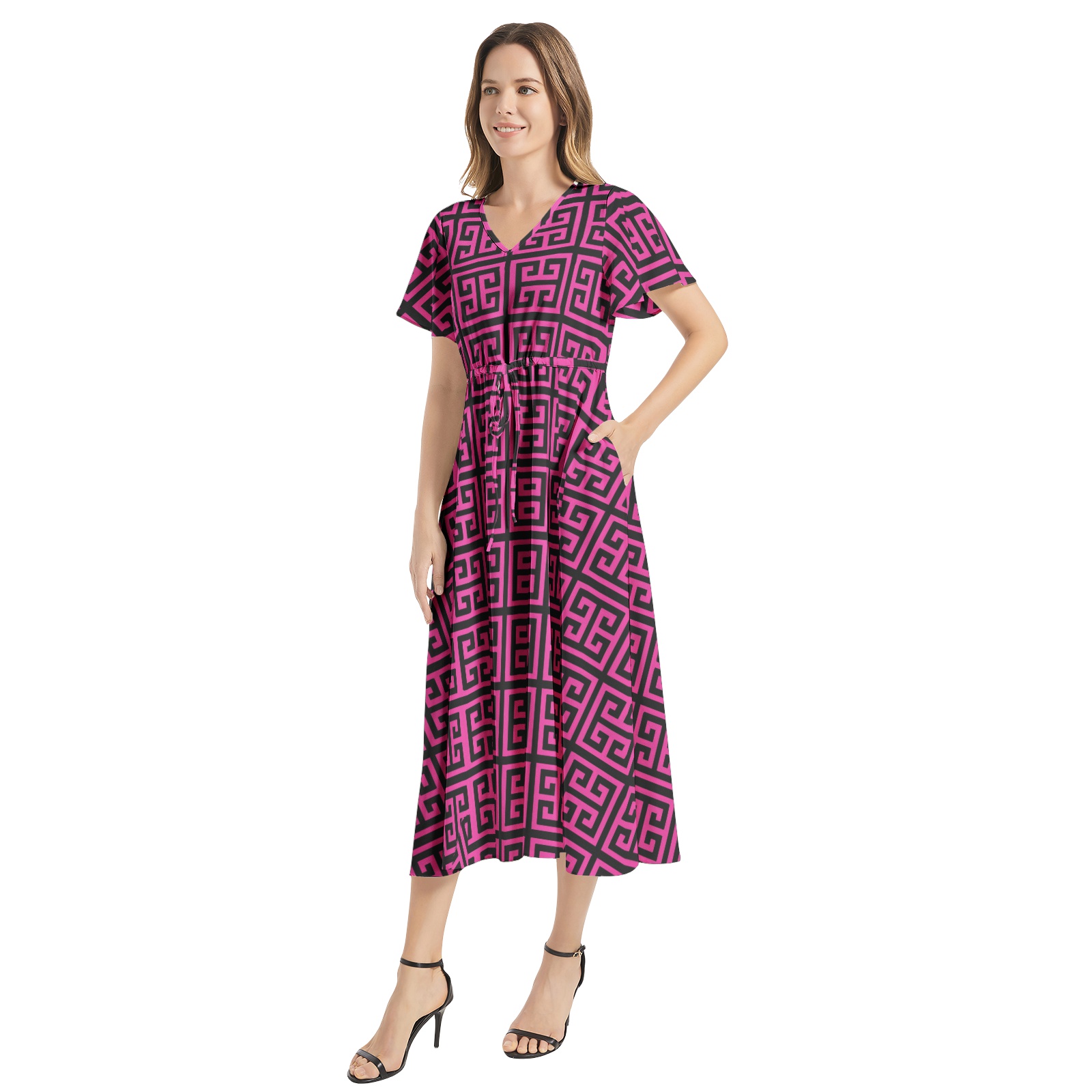 Butterfly short sleeve, Waist drawstring, Flared hem, Two inseam pockets, Women’s elegant midi dress