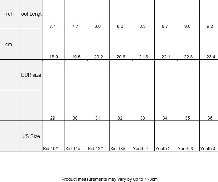 | US Size | Kid 10# | Kid 11# | Kid 12# | Kid 13# | Youth 1 | Youth 2 | Youth 3 | Youth 4 | |