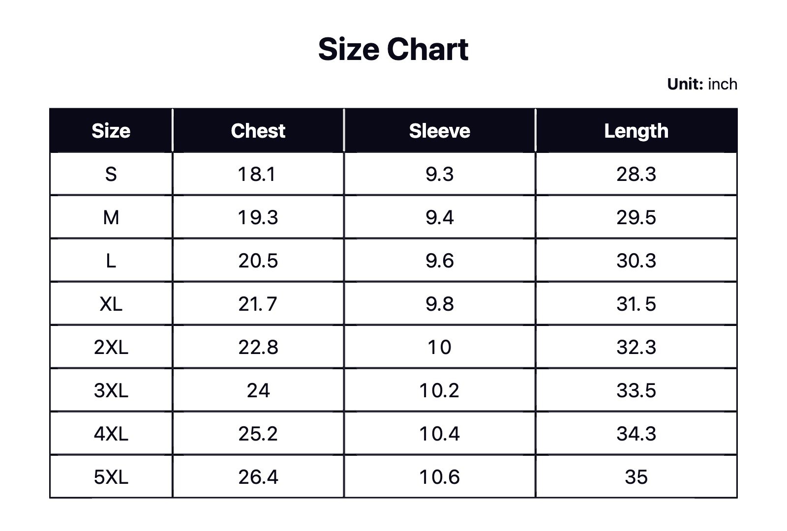 | Size | Chest(cm) | Sleeve(cm) | Length(cm) |