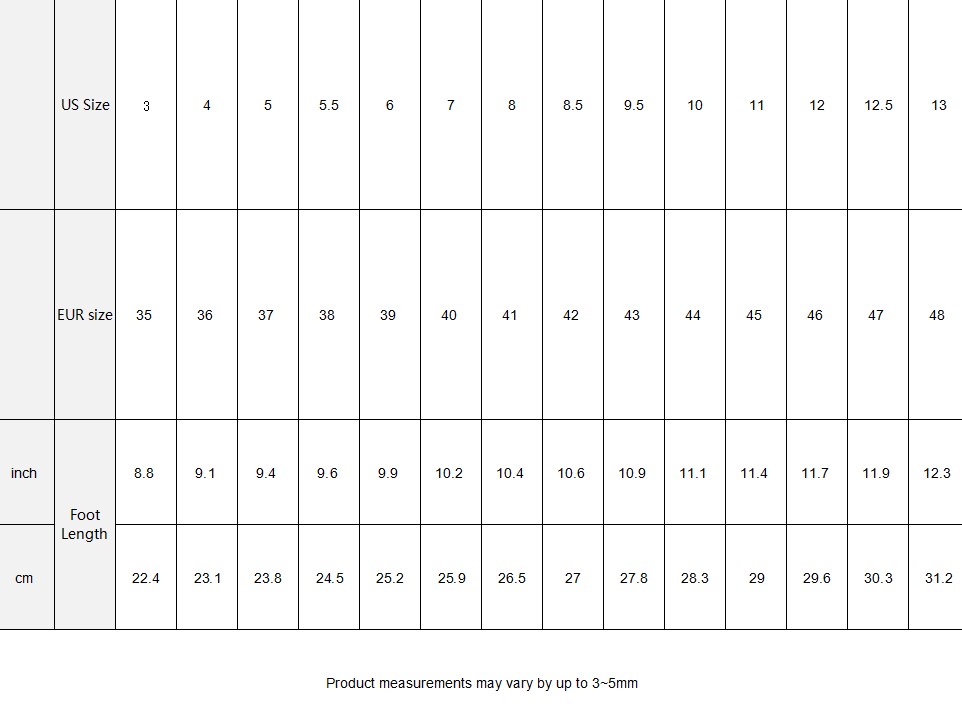 US Size 3 4 5 5.5 6 7 8 8.5 9.5 10 11 12 12.5 13
