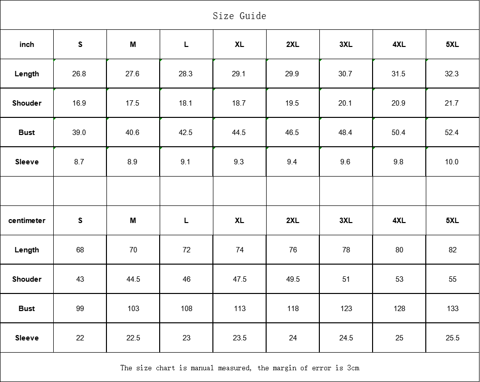 | inch | S | M | L | XL | 2XL | 3XL | 4XL | 5XL |