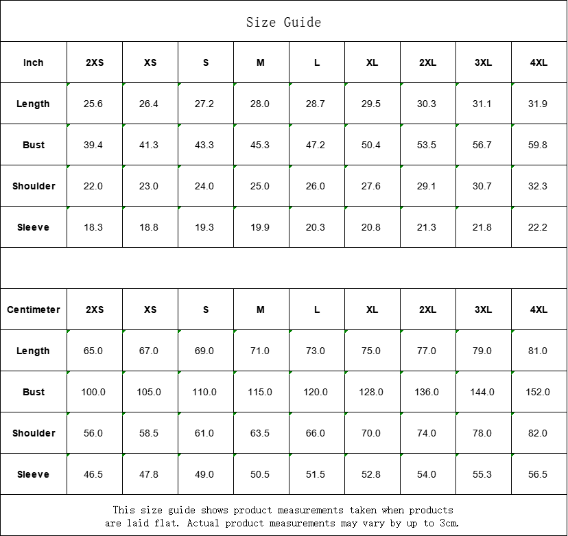 Centimeter 2XS XS S M L XL 2XL 3XL 4XL