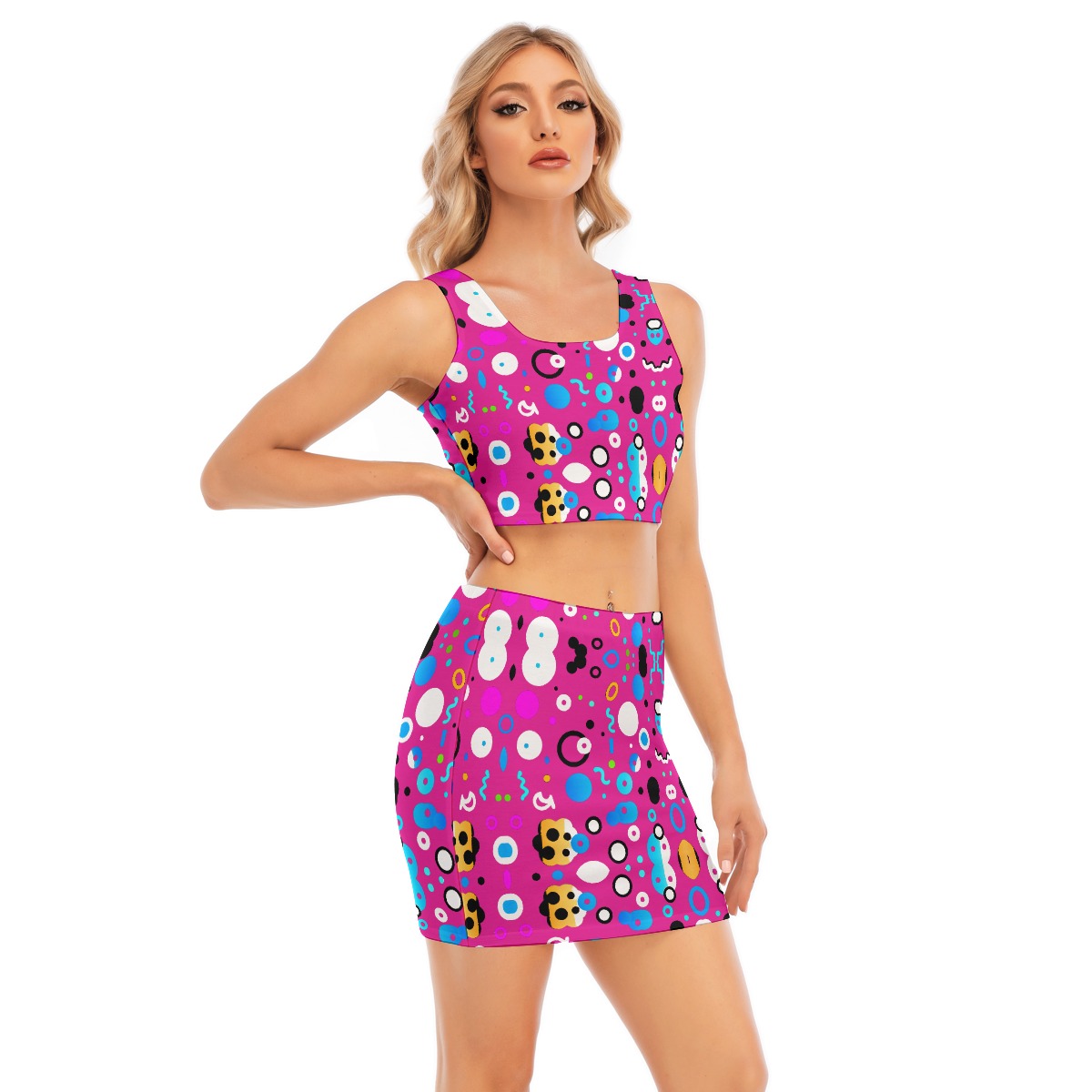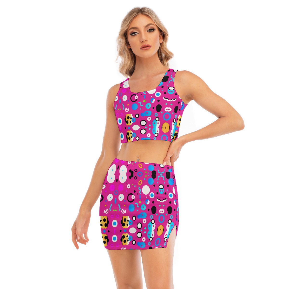 Two piece, elastic cami crop top and wrap skirt, suitable for summer beach wear and going out.