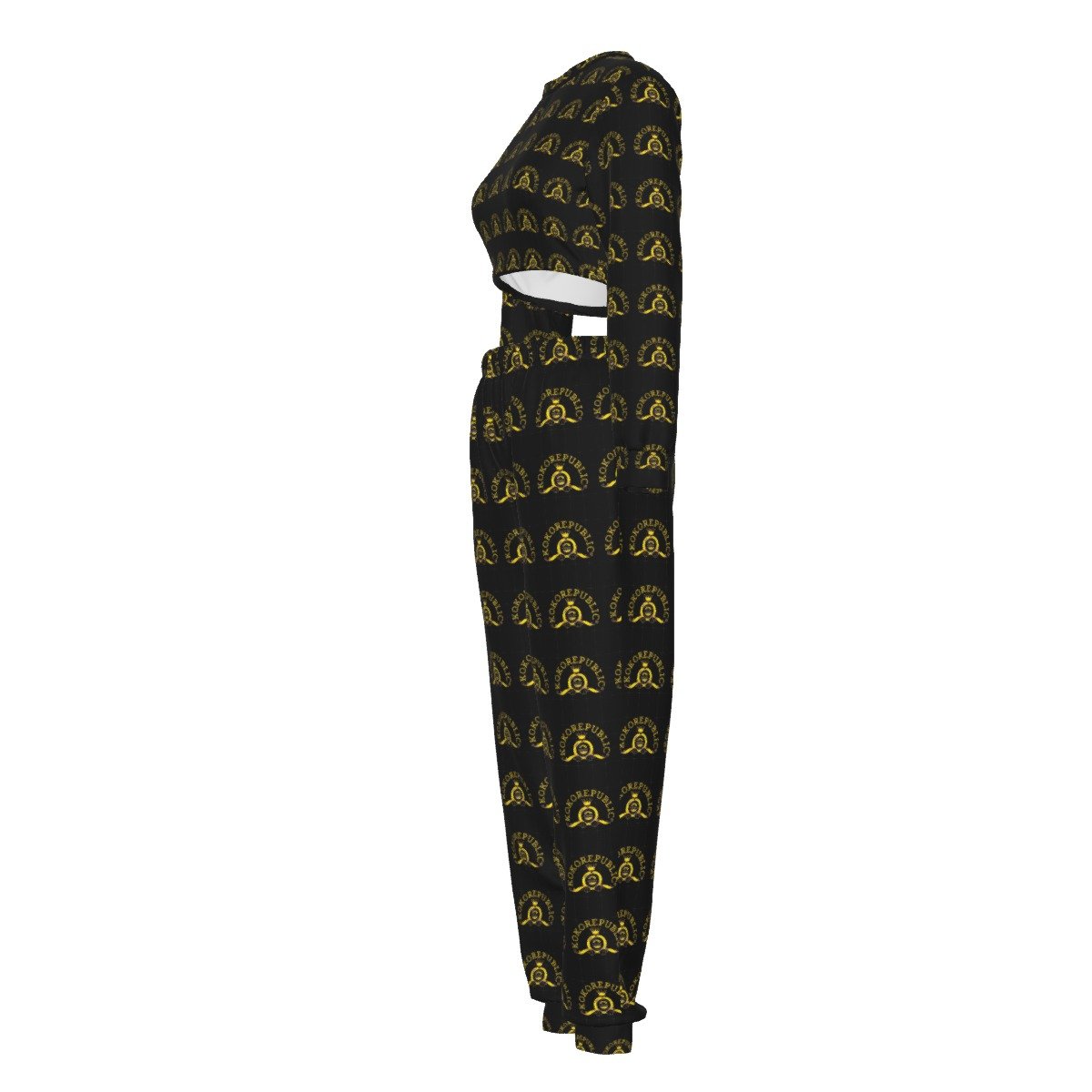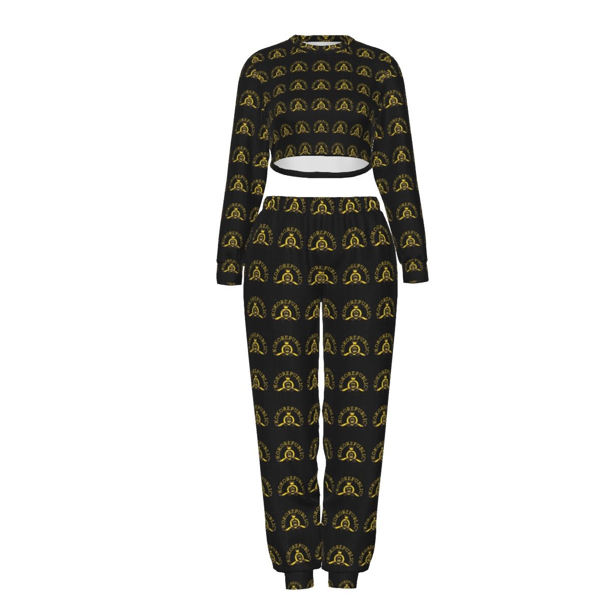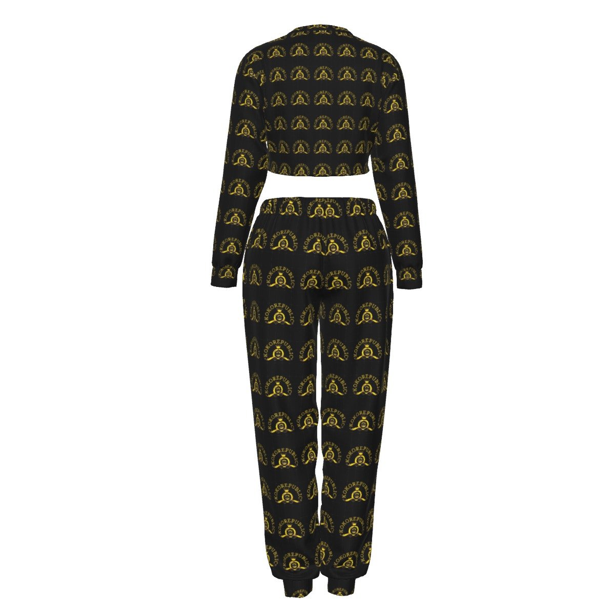 - Crop top, with loose pants, elastic band.