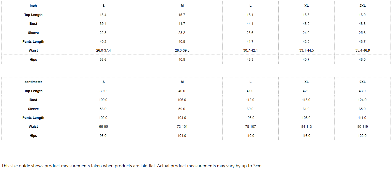 This size guide shows product measurements taken when products are laid flat. Actual product measurements may vary by up to 3cm.