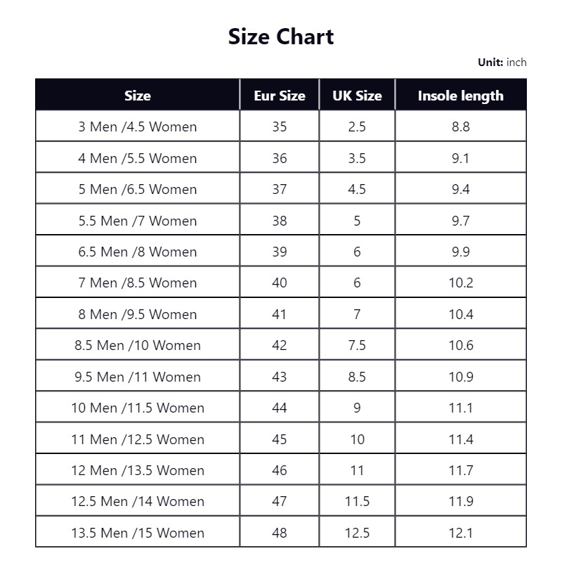 4 Men / 5.5 Women, 3 Men / 4.5 Women, 5 Men / 6.5 Women, 5.5 Men / 7 Women, 6.5 Men / 8 Women, 7 Men / 8.5 Women, 8 Men / 9.5 Women, 8.5 Men / 10 Women, 9.5 Men / 11 Women, 10 Men / 11.5 Women, 11 Men / 12.5 Women, 12 Men / 13.5 Women, 12.5 Men / 14 Women, 13.5 Men / 15 Women